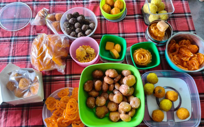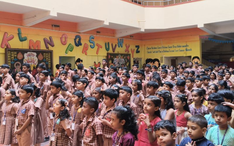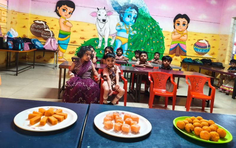 As part of the celebration, children brought orange-coloured sweets, which were displayed attractively to mark the theme of the day. A class-wise door decoration competition was also conducted for Grades 1 to 5, showcasing the creativity of both students and teachers. The children from KG to Grade 2 came dressed in traditional attire, adding charm and cultural touch to the celebration.