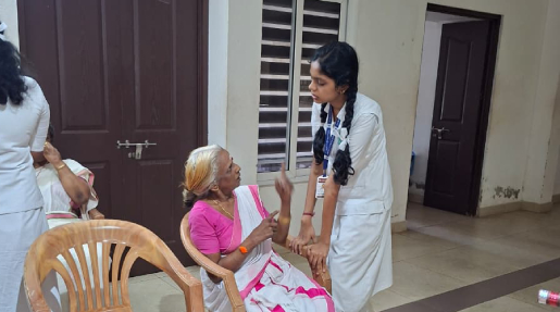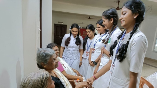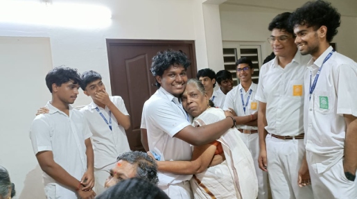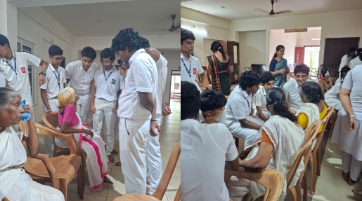 Students also spent valuable time with the elderly, engaging in conversations and sharing moments of happiness. A representative from Santipani Sevasadhanam, Kecheri, was present to receive the collected items.