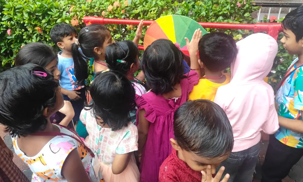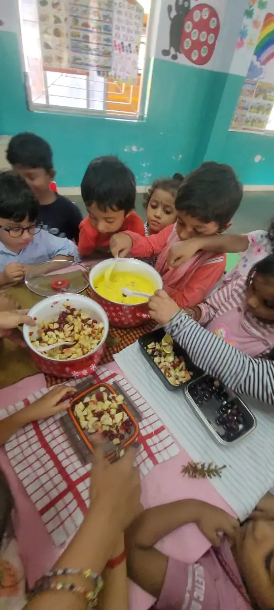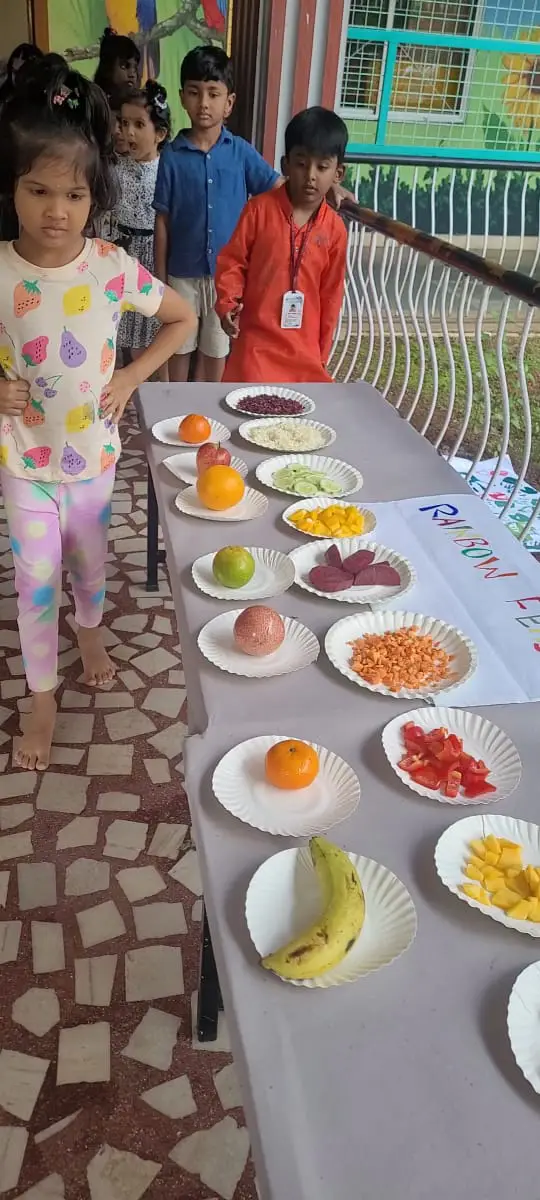 Dress Code for the event is that all children come dressed in bright and colorful clothes. The colors added vibrance to the day. We had activities like a color wheel, colorful food items, and an umbrella dance. Children joyfully participated in coloring an umbrella with different colors and also made kids to have handprints with their favorite colors. At last, teachers and kids prepared a fruit salad by the LKG kids, which made it more fun and memorable.