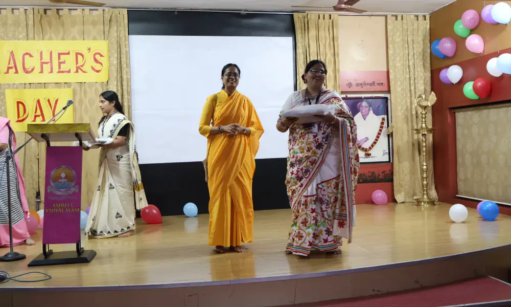 Class XI students at Amrita Vidyalayam orchestrated a heart-warming and joyous Teachers’ Day celebration that beautifully captured the spirit of gratitude and fun. The program opened with touching speeches that honoured the pivotal role of educators in shaping every student’s future, followed by an array of lively games—garbha and musical chairs among them—that had everyone laughing and celebrating together. In a meaningful gesture reflective of Amma’s blessings, prasadam was lovingly offered to the teachers. The day’s thoughtful combination of appreciation, entertainment, and reverence made it a truly memorable tribute to the selfless efforts of our beloved teachers.