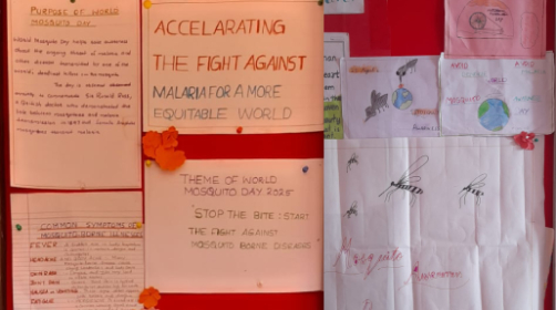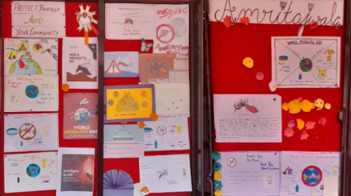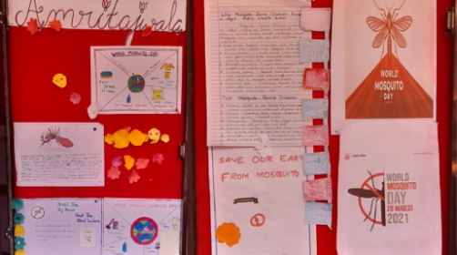 Amrita Vidyalayam, Pathanamthitta, observed World Mosquito Day with the objective of educating students about the harmful effects of mosquitoes and the importance of prevention. As part of the program, a bulletin board competition was organized for students in Classes VI–VIII, where they creatively presented charts, posters, and slogans highlighting mosquito-borne diseases and methods of control. An informative speech was delivered during the morning assembly, emphasizing the dangers of diseases such as malaria and dengue, while encouraging students to adopt simple preventive practices like maintaining cleanliness in their surroundings and avoiding stagnant water. The event not only enhanced awareness but also instilled a sense of responsibility among students to safeguard their health and contribute to a cleaner, healthier environment.